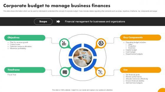 This slide shows information which can be used by individuals to understand the concept of corporate budget. It also includes details regarding other elements such as scope, objectives, timeframe, key components and usage. Do you have an important presentation coming up Are you looking for something that will make your presentation stand out from the rest Look no further than Corporate Budget To Manage Business Finances Effective And Efficient Tools To Develop Fin SS V. With our professional designs, you can trust that your presentation will pop and make delivering it a smooth process. And with Slidegeeks, you can trust that your presentation will be unique and memorable. So why wait Grab Corporate Budget To Manage Business Finances Effective And Efficient Tools To Develop Fin SS V today and make your presentation stand out from the rest This slide shows information which can be used by individuals to understand the concept of corporate budget. It also includes details regarding other elements such as scope, objectives, timeframe, key components and usage.