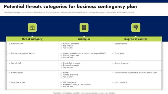This slide shows various threats that should be included for designing business contingency plan with degree of control. It includes categories of threat, examples and degree of control, etc. Showcasing this set of slides titled Potential Threats Categories For Business Contingency Plan Designs Pdf. The topics addressed in these templates are Threat Category, Examples, Degree Of Control. All the content presented in this PPT design is completely editable. Download it and make adjustments in color, background, font etc. as per your unique business setting. This slide shows various threats that should be included for designing business contingency plan with degree of control. It includes categories of threat, examples and degree of control, etc.