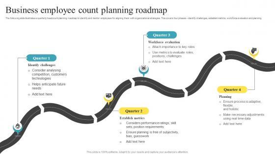 The following slide illustrates a quarterly headcount planning roadmap to identify and mentor employees for aligning them with organizational strategies. This covers four phases identify challenges, establish metrics, workforce evaluation and planning Showcasing this set of slides titled Business Employee Count Planning Roadmap Ideas Pdf. The topics addressed in these templates are Identify Challenges, Workforce Evaluation, Establish Metrics. All the content presented in this PPT design is completely editable. Download it and make adjustments in color, background, font etc. as per your unique business setting. The following slide illustrates a quarterly headcount planning roadmap to identify and mentor employees for aligning them with organizational strategies. This covers four phases identify challenges, establish metrics, workforce evaluation and planning