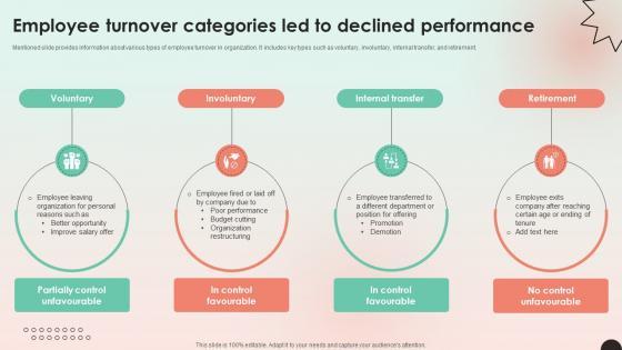 Mentioned slide provides information about various types of employee turnover in organization. It includes key types such as voluntary, involuntary, internal transfer, and retirement. This Web Consulting Business Employee Turnover Categories Led To Declined is perfect for any presentation, be it in front of clients or colleagues. It is a versatile and stylish solution for organizing your meetings. The Web Consulting Business Employee Turnover Categories Led To Declined features a modern design for your presentation meetings. The adjustable and customizable slides provide unlimited possibilities for acing up your presentation. Slidegeeks has done all the homework before launching the product for you. So, do not wait, grab the presentation templates today Mentioned slide provides information about various types of employee turnover in organization. It includes key types such as voluntary, involuntary, internal transfer, and retirement.
