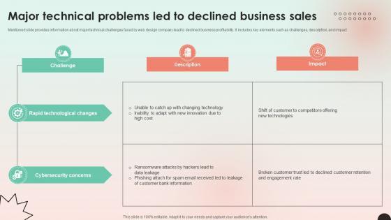 Mentioned slide provides information about major technical challenges faced by web design company lead to declined business profitability. It includes key elements such as challenges, description, and impact. Do you know about Slidesgeeks Managing Technical And Non Major Technical Problems Led To Declined Business Sales These are perfect for delivering any kind od presentation. Using it, create PowerPoint presentations that communicate your ideas and engage audiences. Save time and effort by using our pre-designed presentation templates that are perfect for a wide range of topic. Our vast selection of designs covers a range of styles, from creative to business, and are all highly customizable and easy to edit. Download as a PowerPoint template or use them as Google Slides themes. Mentioned slide provides information about major technical challenges faced by web design company lead to declined business profitability. It includes key elements such as challenges, description, and impact.
