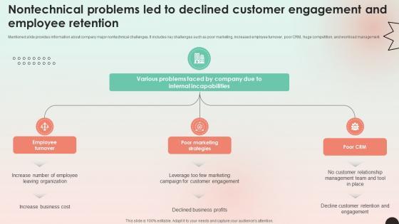 Mentioned slide provides information about company major nontechnical challenges. It includes key challenges such as poor marketing, increased employee turnover, poor CRM, huge competition, and workload management. Slidegeeks is one of the best resources for PowerPoint templates. You can download easily and regulate Web Consulting Business Nontechnical Problems Led To Declined Customer for your personal presentations from our wonderful collection. A few clicks is all it takes to discover and get the most relevant and appropriate templates. Use our Templates to add a unique zing and appeal to your presentation and meetings. All the slides are easy to edit and you can use them even for advertisement purposes. Mentioned slide provides information about company major nontechnical challenges. It includes key challenges such as poor marketing, increased employee turnover, poor CRM, huge competition, and workload management.