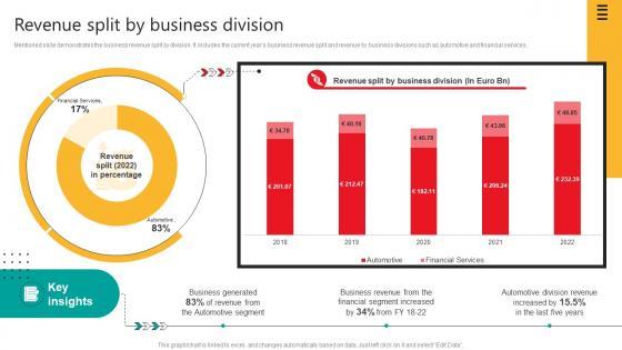 Mentioned slide demonstrates the business revenue split by division. It includes the current years business revenue split and revenue by business divisions such as automotive and financial services.Take your projects to the next level with our ultimate collection of Revenue Split By Business Division Automobile Development Company Profile CP SS V. Slidegeeks has designed a range of layouts that are perfect for representing task or activity duration, keeping track of all your deadlines at a glance. Tailor these designs to your exact needs and give them a truly corporate look with your own brand colors they will make your projects stand out from the rest Mentioned slide demonstrates the business revenue split by division. It includes the current years business revenue split and revenue by business divisions such as automotive and financial services.