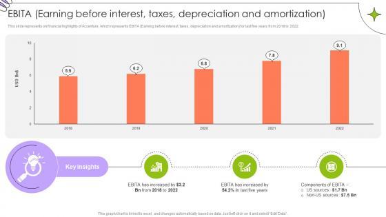 This slide represents on financial highlights of Accenture, which represents EBITA Earning before interest, taxes, depreciation and amortization for last five years from 2018 to 2022.Whether you have daily or monthly meetings, a brilliant presentation is necessary. Ebita Earning Before Interest Taxes Global Innovation And Business Solutions Company Profile CP SS V can be your best option for delivering a presentation. Represent everything in detail using Ebita Earning Before Interest Taxes Global Innovation And Business Solutions Company Profile CP SS V and make yourself stand out in meetings. The template is versatile and follows a structure that will cater to your requirements. All the templates prepared by Slidegeeks are easy to download and edit. Our research experts have taken care of the corporate themes as well. So, give it a try and see the results. This slide represents on financial highlights of Accenture, which represents EBITA Earning before interest, taxes, depreciation and amortization for last five years from 2018 to 2022.
