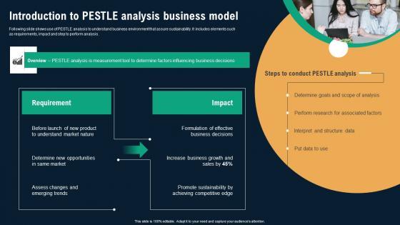 Following slide shows use of PESTLE analysis to understand business environment that assure sustainability. It includes elements such as requirements, impact and step to perform analysis. Explore a selection of the finest Introduction To Pestle Analysis Business Model Business Environmental Analysis Professional Pdf here. With a plethora of professionally designed and pre-made slide templates, you can quickly and easily find the right one for your upcoming presentation. You can use our Introduction To Pestle Analysis Business Model Business Environmental Analysis Professional Pdf to effectively convey your message to a wider audience. Slidegeeks has done a lot of research before preparing these presentation templates. The content can be personalized and the slides are highly editable. Grab templates today from Slidegeeks. Following slide shows use of PESTLE analysis to understand business environment that assure sustainability. It includes elements such as requirements, impact and step to perform analysis.
