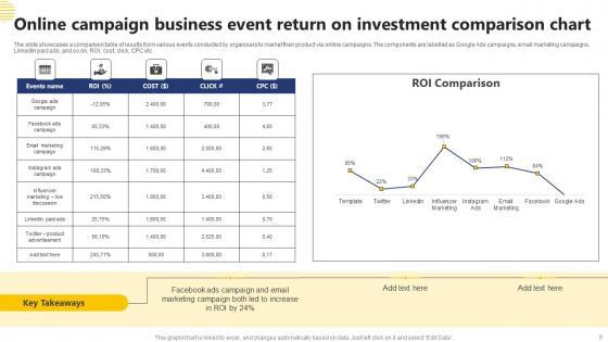 The slide showcases a comparison table of results from various events conducted by organisers to market their product via online campaigns. The components are labelled as Google Ads campaigns, email marketing campaigns, LinkedIn paid ads, and so on. ROI, cost, click, CPC etc. Pitch your topic with ease and precision using this Online Campaign Business Event Return On Investment Comparison Chart Demonstration Pdf This layout presents information on Google Ads Campaign, Email Marketing Campaign It is also available for immediate download and adjustment. So, changes can be made in the color, design, graphics or any other component to create a unique layout. The slide showcases a comparison table of results from various events conducted by organisers to market their product via online campaigns. The components are labelled as Google Ads campaigns, email marketing campaigns, LinkedIn paid ads, and so on. ROI, cost, click, CPC etc.
