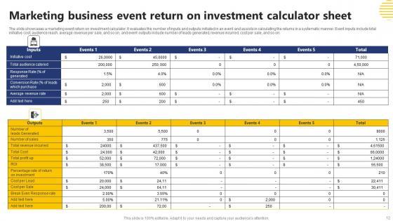 The slide showcases a marketing event return on investment calculator. It evaluates the number of inputs and outputs initiated in an event and assists in calculating the returns in a systematic manner. Event inputs include total initiative cost, audience reach, average revenue per sale, and so on, and event outputs include number of leads generated, revenue incurred, cost per sale, and so on. Pitch your topic with ease and precision using this Marketing Business Event Return On Investment Calculator Sheet Formats Pdf This layout presents information on Leads Generated, Marketing Business, Calculator Sheet It is also available for immediate download and adjustment. So, changes can be made in the color, design, graphics or any other component to create a unique layout. The slide showcases a marketing event return on investment calculator. It evaluates the number of inputs and outputs initiated in an event and assists in calculating the returns in a systematic manner. Event inputs include total initiative cost, audience reach, average revenue per sale, and so on, and event outputs include number of leads generated, revenue incurred, cost per sale, and so on.