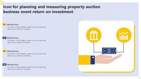 Pitch your topic with ease and precision using this Icon For Planning And Measuring Property Auction Business Event Return On Investment Slides Pdf This layout presents information on Icon For Planning And Measuring, Property Auction, Business Event It is also available for immediate download and adjustment. So, changes can be made in the color, design, graphics or any other component to create a unique layout. Our Icon For Planning And Measuring Property Auction Business Event Return On Investment Slides Pdf are topically designed to provide an attractive backdrop to any subject. Use them to look like a presentation pro.