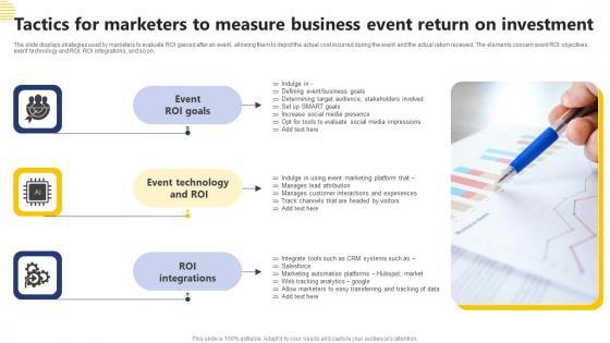 The slide displays strategies used by marketers to evaluate ROI gained after an event, allowing them to depict the actual cost incurred during the event and the actual return received. The elements concern event ROI objectives, event technology and ROI, ROI integrations, and so on. Showcasing this set of slides titled Tactics For Marketers To Measure Business Event Return On Investment Infographics Pdf The topics addressed in these templates are Event ROI Goals, Event Technology, ROI Integrations All the content presented in this PPT design is completely editable. Download it and make adjustments in color, background, font etc. as per your unique business setting. The slide displays strategies used by marketers to evaluate ROI gained after an event, allowing them to depict the actual cost incurred during the event and the actual return received. The elements concern event ROI objectives, event technology and ROI, ROI integrations, and so on.