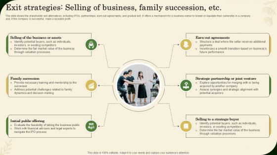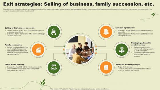 The slide shows the stakeholder exit alternatives, including IPOs, partnerships, earn-out agreements, and gradual exit. It offers a mechanism for a business owner to lessen or liquidate their ownership in a company and, if the company is successful, make a sizeable profit. Find highly impressive Exit Strategies Selling Of Business Family Succession Etc Landscaping Business Plan Ppt Presentation BP SS V on Slidegeeks to deliver a meaningful presentation. You can save an ample amount of time using these presentation templates. No need to worry to prepare everything from scratch because Slidegeeks experts have already done a huge research and work for you. You need to download Exit Strategies Selling Of Business Family Succession Etc Landscaping Business Plan Ppt Presentation BP SS V for your upcoming presentation. All the presentation templates are 100 percent editable and you can change the color and personalize the content accordingly. Download now The slide shows the stakeholder exit alternatives, including IPOs, partnerships, earn-out agreements, and gradual exit. It offers a mechanism for a business owner to lessen or liquidate their ownership in a company and, if the company is successful, make a sizeable profit.