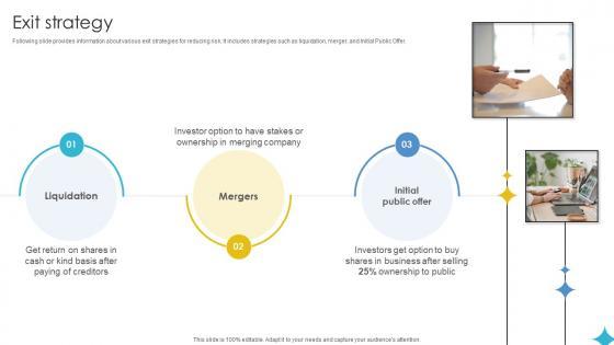 Following slide provides information about various exit strategies for reducing risk. It includes strategies such as liquidation, merger, and Initial Public Offer. From laying roadmaps to briefing everything in detail, our templates are perfect for you. You can set the stage with your presentation slides. All you have to do is download these easy-to-edit and customizable templates. Exit Strategy Investor Funding Elevator Pitch Deck For Business Operations Management Platform will help you deliver an outstanding performance that everyone would remember and praise you for. Do download this presentation today. Following slide provides information about various exit strategies for reducing risk. It includes strategies such as liquidation, merger, and Initial Public Offer.