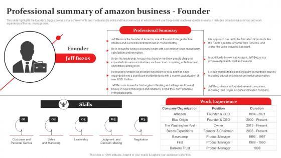 This slide highlights the founders biggest professional achievements and most valuable skills and the proven ways in which she will use those skills to achieve valuable results. It includes professional summary and work experience of the key management. Take your projects to the next level with our ultimate collection of Professional Summary Of Amazon Business Founder Information Pdf. Slidegeeks has designed a range of layouts that are perfect for representing task or activity duration, keeping track of all your deadlines at a glance. Tailor these designs to your exact needs and give them a truly corporate look with your own brand colors they will make your projects stand out from the rest This slide highlights the founders biggest professional achievements and most valuable skills and the proven ways in which she will use those skills to achieve valuable results. It includes professional summary and work experience of the key management.