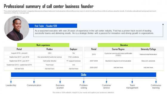 This slide highlights the founders biggest professional achievements and most valuable skills and the proven ways in which he will use those skills to achieve valuable results. It includes educational background and work experience of the key management. Retrieve professionally designed Professional Summary Of Call Center Business Founder BPO Center Business Plan Download Pdf to effectively convey your message and captivate your listeners. Save time by selecting pre-made slideshows that are appropriate for various topics, from business to educational purposes. These themes come in many different styles, from creative to corporate, and all of them are easily adjustable and can be edited quickly. Access them as PowerPoint templates or as Google Slides themes. You do not have to go on a hunt for the perfect presentation because Slidegeeks got you covered from everywhere. This slide highlights the founders biggest professional achievements and most valuable skills and the proven ways in which he will use those skills to achieve valuable results. It includes educational background and work experience of the key management.