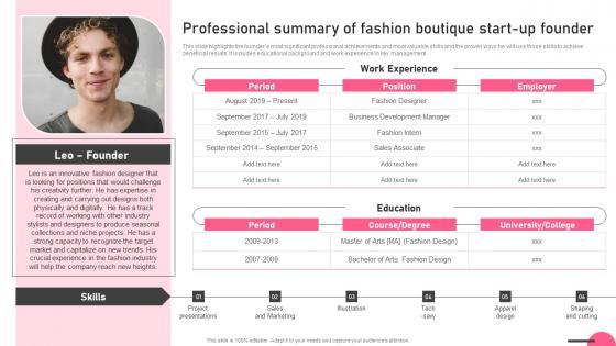 This slide highlights the founders most significant professional achievements and most valuable skills and the proven ways he will use those skills to achieve beneficial results. It includes educational background and work experience in key management. This Professional Summary Of Fashion Boutique Start Up Founder Boutique Business Themes Pdf from Slidegeeks makes it easy to present information on your topic with precision. It provides customization options, so you can make changes to the colors, design, graphics, or any other component to create a unique layout. It is also available for immediate download, so you can begin using it right away. Slidegeeks has done good research to ensure that you have everything you need to make your presentation stand out. Make a name out there for a brilliant performance. This slide highlights the founders most significant professional achievements and most valuable skills and the proven ways he will use those skills to achieve beneficial results. It includes educational background and work experience in key management.