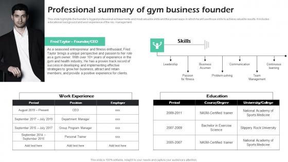 This slide highlights the founders biggest professional achievements and most valuable skills and the proven ways in which he will use those skills to achieve valuable results. It includes educational background and work experience of the key management. Take your projects to the next level with our ultimate collection of Professional Summary Of Gym Business Founder Fitness Center Business Plan Ideas Pdf Slidegeeks has designed a range of layouts that are perfect for representing task or activity duration, keeping track of all your deadlines at a glance. Tailor these designs to your exact needs and give them a truly corporate look with your own brand colors they well make your projects stand out from the rest. This slide highlights the founders biggest professional achievements and most valuable skills and the proven ways in which he will use those skills to achieve valuable results. It includes educational background and work experience of the key management.