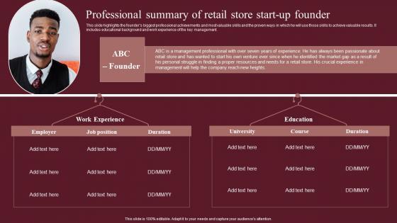 This slide highlights the founders biggest professional achievements and most valuable skills and the proven ways in which he will use those skills to achieve valuable results. It includes educational background and work experience of the key management. Are you searching for a Professional Summary Of Retail Store Start Up Founder Fashion Business Plan Clipart Pdf that is uncluttered, straightforward, and original Its easy to edit, and you can change the colors to suit your personal or business branding. For a presentation that expresses how much effort you have put in, this template is ideal With all of its features, including tables, diagrams, statistics, and lists, its perfect for a business plan presentation. Make your ideas more appealing with these professional slides. Download Professional Summary Of Retail Store Start Up Founder Fashion Business Plan Clipart Pdf from Slidegeeks today. This slide highlights the founders biggest professional achievements and most valuable skills and the proven ways in which he will use those skills to achieve valuable results. It includes educational background and work experience of the key management.