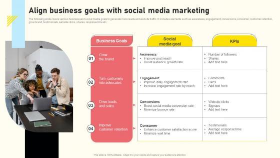 The following slide covers various business and social media goals to generate more leads and website traffic. It includes elements such as awareness, engagement, conversions, consumer, customer retention, grow brand, testimonials, website clicks, shares, response time etc. This modern and well-arranged Effective Real Time Marketing Principles Align Business Goals With Social Media Marketing Template Pdf provides lots of creative possibilities. It is very simple to customize and edit with the Powerpoint Software. Just drag and drop your pictures into the shapes. All facets of this template can be edited with Powerpoint, no extra software is necessary. Add your own material, put your images in the places assigned for them, adjust the colors, and then you can show your slides to the world, with an animated slide included. The following slide covers various business and social media goals to generate more leads and website traffic. It includes elements such as awareness, engagement, conversions, consumer, customer retention, grow brand, testimonials, website clicks, shares, response time etc.