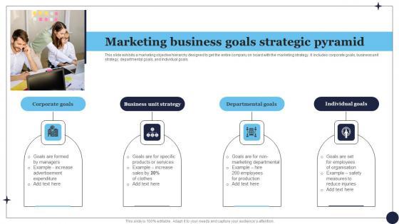 This slide exhibits a marketing objective hierarchy designed to get the entire company on board with the marketing strategy. It includes corporate goals, business unit strategy, departmental goals, and individual goals. Showcasing this set of slides titled Marketing Business Goals Strategic Pyramid Themes Pdf The topics addressed in these templates are Corporate Goals, Business Unit Strategy, Departmental Goals All the content presented in this PPT design is completely editable. Download it and make adjustments in color, background, font etc. as per your unique business setting. This slide exhibits a marketing objective hierarchy designed to get the entire company on board with the marketing strategy. It includes corporate goals, business unit strategy, departmental goals, and individual goals.