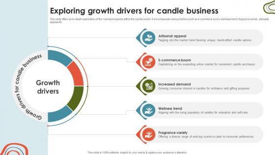 This slide offers an in-depth exploration of the market prospects within the candle sector. It encompasses various factors such as e-commerce boom, wellness trend, fragrance variety, artisanal appeal etc. Are you in need of a template that can accommodate all of your creative concepts This one is crafted professionally and can be altered to fit any style. Use it with Google Slides or PowerPoint. Include striking photographs, symbols, depictions, and other visuals. Fill, move around, or remove text boxes as desired. Test out color palettes and font mixtures. Edit and save your work, or work with colleagues. Download Candle Business Venture Exploring Growth Drivers For Candle Business BP SS V and observe how to make your presentation outstanding. Give an impeccable presentation to your group and make your presentation unforgettable. This slide offers an in-depth exploration of the market prospects within the candle sector. It encompasses various factors such as e-commerce boom, wellness trend, fragrance variety, artisanal appeal etc.