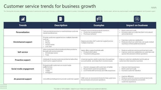 The following slide showcases various emerging trends of customer service and support that plays crucial role in business growth and success. It showcases trends such as personalization, omni channel support, self service, proactive support, social media engagement and AI powered support. This Customer Service Trends For Business Growth Microsoft Pdf from Slidegeeks makes it easy to present information on your topic with precision. It provides customization options, so you can make changes to the colors, design, graphics, or any other component to create a unique layout. It is also available for immediate download, so you can begin using it right away. Slidegeeks has done good research to ensure that you have everything you need to make your presentation stand out. Make a name out there for a brilliant performance. The following slide showcases various emerging trends of customer service and support that plays crucial role in business growth and success. It showcases trends such as personalization, omni channel support, self service, proactive support, social media engagement and AI powered support.