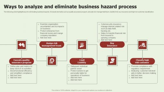 The following slide highlight ways for eliminating business hazards. It include elements such as quality assurance program, allocate risk management team, liability limit, buy insurance and high risk customer classification. Pitch your topic with ease and precision using this Ways To Analyze And Eliminate Business Hazard Process Infographics Pdf. This layout presents information on Execute Quality, Management Team, Buy Insurance. It is also available for immediate download and adjustment. So, changes can be made in the color, design, graphics or any other component to create a unique layout. The following slide highlight ways for eliminating business hazards. It include elements such as quality assurance program, allocate risk management team, liability limit, buy insurance and high risk customer classification.