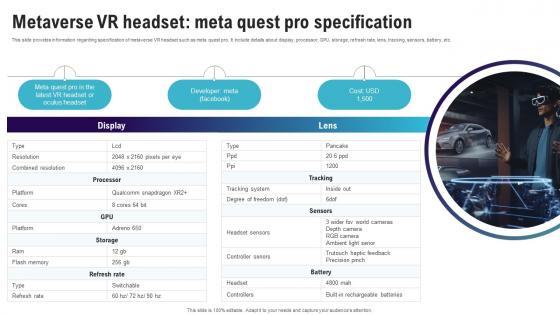 This slide provides information regarding specification of metaverse VR headset such as meta quest pro. It include details about display, processor, GPU, storage, refresh rate, lens, tracking, sensors, battery, etc. Want to ace your presentation in front of a live audience Our Metaverse VR Headset Meta Quest Pro Continuum Of Technology Revamping Business AI SS V can help you do that by engaging all the users towards you. Slidegeeks experts have put their efforts and expertise into creating these impeccable powerpoint presentations so that you can communicate your ideas clearly. Moreover, all the templates are customizable, and easy-to-edit and downloadable. Use these for both personal and commercial use. This slide provides information regarding specification of metaverse VR headset such as meta quest pro. It include details about display, processor, GPU, storage, refresh rate, lens, tracking, sensors, battery, etc.