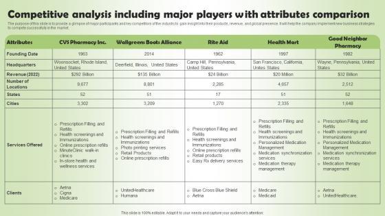 The purpose of this slide is to provide a glimpse of major participants and key competitors of the industry to gain insight into their products, revenue, and global presence. It will help the company implement new business strategies to compete successfully in the market. From laying roadmaps to briefing everything in detail, our templates are perfect for you. You can set the stage with your presentation slides. All you have to do is download these easy to edit and customizable templates. Competitive Analysis Including Major Pharmacy Business Plan Go To Market Strategy Themes Pdf will help you deliver an outstanding performance that everyone would remember and praise you for. Do download this presentation today. The purpose of this slide is to provide a glimpse of major participants and key competitors of the industry to gain insight into their products, revenue, and global presence. It will help the company implement new business strategies to compete successfully in the market.