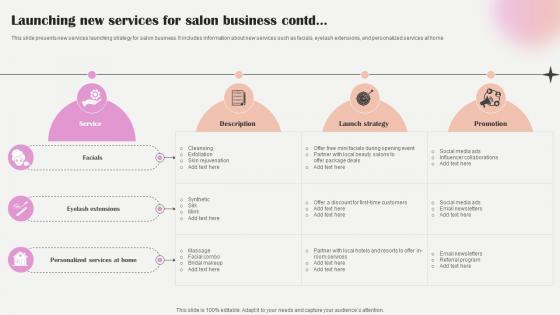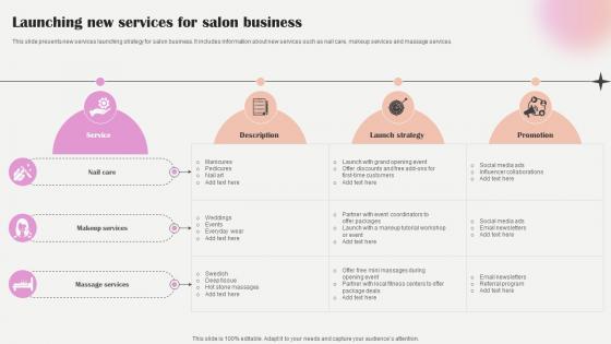 This slide presents new services launching strategy for salon business. It includes information about new services such as nail care, makeup services and massage services. Want to ace your presentation in front of a live audience Our Salon Marketing Plan To Optimize Launching New Services For Salon Business Strategy SS V can help you do that by engaging all the users towards you. Slidegeeks experts have put their efforts and expertise into creating these impeccable powerpoint presentations so that you can communicate your ideas clearly. Moreover, all the templates are customizable, and easy-to-edit and downloadable. Use these for both personal and commercial use. This slide presents new services launching strategy for salon business. It includes information about new services such as nail care, makeup services and massage services.