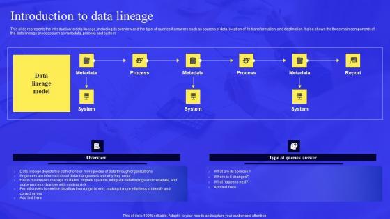 This slide represents the introduction to data lineage, including its overview and the type of queries it answers such as sources of data, location of its transformation, and destination. It also shows the three main components of the data lineage process such as metadata, process and system. This Business Process Data Lineage Introduction To Data Lineage Microsoft Pdf from Slidegeeks makes it easy to present information on your topic with precision. It provides customization options, so you can make changes to the colors, design, graphics, or any other component to create a unique layout. It is also available for immediate download, so you can begin using it right away. Slidegeeks has done good research to ensure that you have everything you need to make your presentation stand out. Make a name out there for a brilliant performance. This slide represents the introduction to data lineage, including its overview and the type of queries it answers such as sources of data, location of its transformation, and destination. It also shows the three main components of the data lineage process such as metadata, process and system.