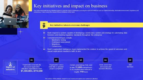 This slide represents the key initiatives taken to solve the banks challenges, including the explored methods such as mainframe testing, distributed environment, migrations, and conversions. It also covers the impact of these initiatives on the bank. Do you know about Slidesgeeks Comprehensive Analysis Of Different Data Lineage Classification Key Initiatives And Impact On Business Mockup PDF These are perfect for delivering any kind od presentation. Using it, create PowerPoint presentations that communicate your ideas and engage audiences. Save time and effort by using our pre designed presentation templates that are perfect for a wide range of topic. Our vast selection of designs covers a range of styles, from creative to business, and are all highly customizable and easy to edit. Download as a PowerPoint template or use them as Google Slides themes.