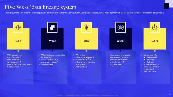 This slide outlines the five Ws of the data lineage system and includes who, what, why, where and when. Each contains a list of questions that help perform data lineage and carry out valuable insights from the information. The Business Process Data Lineage Five Ws Of Data Lineage System Summary Pdf is a compilation of the most recent design trends as a series of slides. It is suitable for any subject or industry presentation, containing attractive visuals and photo spots for businesses to clearly express their messages. This template contains a variety of slides for the user to input data, such as structures to contrast two elements, bullet points, and slides for written information. Slidegeeks is prepared to create an impression. This slide outlines the five Ws of the data lineage system and includes who, what, why, where and when. Each contains a list of questions that help perform data lineage and carry out valuable insights from the information.