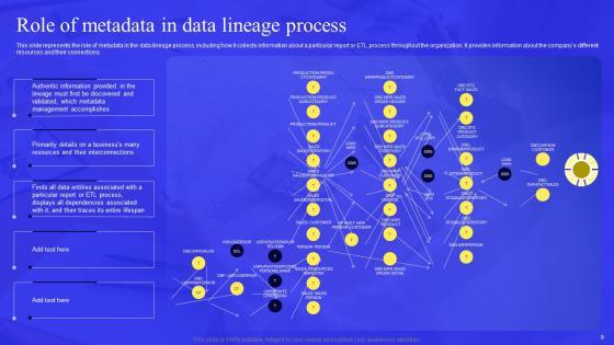 This slide represents the role of metadata in the data lineage process, including how it collects information about a particular report or ETL process throughout the organization. It provides information about the companys different resources and their connections. Do you have an important presentation coming up Are you looking for something that will make your presentation stand out from the rest Look no further than Business Process Data Lineage Role Of Metadata In Data Lineage Process Portrait Pdf. With our professional designs, you can trust that your presentation will pop and make delivering it a smooth process. And with Slidegeeks, you can trust that your presentation will be unique and memorable. So why wait Grab Business Process Data Lineage Role Of Metadata In Data Lineage Process Portrait Pdf today and make your presentation stand out from the rest This slide represents the role of metadata in the data lineage process, including how it collects information about a particular report or ETL process throughout the organization. It provides information about the companys different resources and their connections.