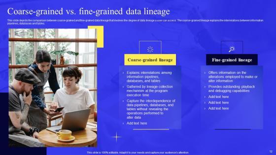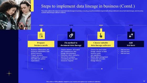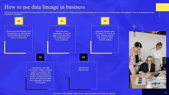 This slide shows how businesses can employ data lineage throughout their organizations, including automatically tracking information flow from source to destination, time-saving for IT teams, and transparency into information connections. Presenting this PowerPoint presentation, titled Data Lineage Implementation How To Use Data Lineage In Business Pictures PDF, with topics curated by our researchers after extensive research. This editable presentation is available for immediate download and provides attractive features when used. Download now and captivate your audience. Presenting this Data Lineage Implementation How To Use Data Lineage In Business Pictures PDF. Our researchers have carefully researched and created these slides with all aspects taken into consideration. This is a completely customizable Data Lineage Implementation How To Use Data Lineage In Business Pictures PDF that is available for immediate downloading. Download now and make an impact on your audience. Highlight the attractive features available with our PPTs.