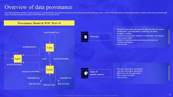 This slide depicts the overview of data provenance, including the type of questions it answers, such as the reason behind data generation, method of info generation, time of data generation, and the owner of the generated data. It also covers the provenance model in World Wide Web Consortium W3C. Want to ace your presentation in front of a live audience Our Business Process Data Lineage Overview Of Data Provenance Structure Pdf can help you do that by engaging all the users towards you. Slidegeeks experts have put their efforts and expertise into creating these impeccable powerpoint presentations so that you can communicate your ideas clearly. Moreover, all the templates are customizable, and easy to edit and downloadable. Use these for both personal and commercial use. This slide depicts the overview of data provenance, including the type of questions it answers, such as the reason behind data generation, method of info generation, time of data generation, and the owner of the generated data. It also covers the provenance model in World Wide Web Consortium W3C.