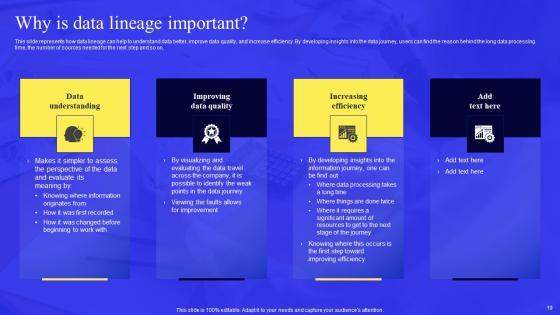 This slide represents how data lineage can help to understand data better, improve data quality, and increase efficiency. By developing insights into the data journey, users can find the reason behind the long data processing time, the number of sources needed for the next step and so on. This modern and well arranged Business Process Data Lineage Why Is Data Lineage Important Brochure Pdf provides lots of creative possibilities. It is very simple to customize and edit with the Powerpoint Software. Just drag and drop your pictures into the shapes. All facets of this template can be edited with Powerpoint, no extra software is necessary. Add your own material, put your images in the places assigned for them, adjust the colors, and then you can show your slides to the world, with an animated slide included. This slide represents how data lineage can help to understand data better, improve data quality, and increase efficiency. By developing insights into the data journey, users can find the reason behind the long data processing time, the number of sources needed for the next step and so on.
