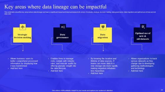 This slide talks about the key areas where data lineage can have a significant impact and help businesses to fix errors. It includes strategic decision making, data governance, data migration and optimal use of new and old data sets. Take your projects to the next level with our ultimate collection of Business Process Data Lineage Key Areas Where Data Lineage Can Be Impactful Clipart Pdf. Slidegeeks has designed a range of layouts that are perfect for representing task or activity duration, keeping track of all your deadlines at a glance. Tailor these designs to your exact needs and give them a truly corporate look with your own brand colors they will make your projects stand out from the rest This slide talks about the key areas where data lineage can have a significant impact and help businesses to fix errors. It includes strategic decision-making, data governance, data migration and optimal use of new and old data sets.