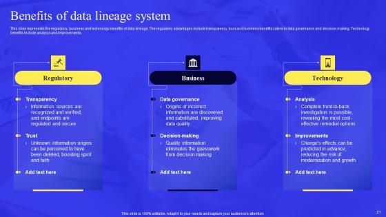 This slide shows how businesses can employ data lineage throughout their organizations, including automatically tracking information flow from source to destination, time saving for IT teams, and transparency into information connections. Presenting this PowerPoint presentation, titled Comprehensive Analysis Of Different Data Lineage Classification How To Use Data Lineage In Business Diagrams PDF, with topics curated by our researchers after extensive research. This editable presentation is available for immediate download and provides attractive features when used. Download now and captivate your audience. Presenting this Comprehensive Analysis Of Different Data Lineage Classification How To Use Data Lineage In Business Diagrams PDF. Our researchers have carefully researched and created these slides with all aspects taken into consideration. This is a completely customizable Comprehensive Analysis Of Different Data Lineage Classification How To Use Data Lineage In Business Diagrams PDF that is available for immediate downloading. Download now and make an impact on your audience. Highlight the attractive features available with our PPTs.