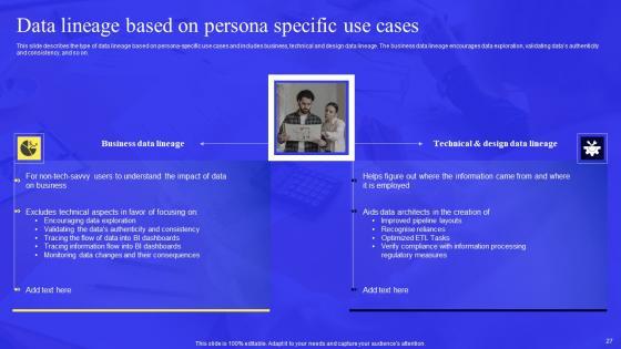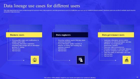 This slide depicts the use cases of data lineage for business users, data engineers, and data governance users to simplify their work and can be helpful in several contexts. Business users can use this to validate report columns and perform data discovery. This modern and well arranged Business Process Data Lineage Data Lineage Use Cases For Different Users Themes Pdf provides lots of creative possibilities. It is very simple to customize and edit with the Powerpoint Software. Just drag and drop your pictures into the shapes. All facets of this template can be edited with Powerpoint, no extra software is necessary. Add your own material, put your images in the places assigned for them, adjust the colors, and then you can show your slides to the world, with an animated slide included. This slide depicts the use cases of data lineage for business users, data engineers, and data governance users to simplify their work and can be helpful in several contexts. Business users can use this to validate report columns and perform data discovery.