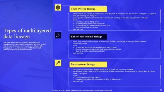 This slide outlines the multi layered data lineage type, including cross system, end to end column, and inner system data lineage. It also caters to the use cases of these data lineage such as analyzing process modification impact, consequences of faulty method and so on. Crafting an eye catching presentation has never been more straightforward. Let your presentation shine with this tasteful yet straightforward Business Process Data Lineage Types Of Multilayered Data Lineage Microsoft Pdf template. It offers a minimalistic and classy look that is great for making a statement. The colors have been employed intelligently to add a bit of playfulness while still remaining professional. Construct the ideal Business Process Data Lineage Types Of Multilayered Data Lineage Microsoft Pdf that effortlessly grabs the attention of your audience Begin now and be certain to wow your customers This slide outlines the multi-layered data lineage type, including cross-system, end-to-end column, and inner-system data lineage. It also caters to the use cases of these data lineage such as analyzing process modification impact, consequences of faulty method and so on.