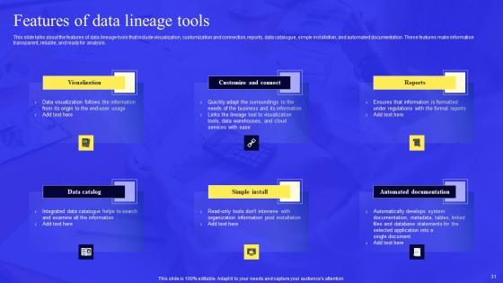 This slide talks about the features of data lineage tools that include visualization, customization and connection, reports, data catalogue, simple installation, and automated documentation. These features make information transparent, reliable, and ready for analysis. The best PPT templates are a great way to save time, energy, and resources. Slidegeeks have 100 percent editable powerpoint slides making them incredibly versatile. With these quality presentation templates, you can create a captivating and memorable presentation by combining visually appealing slides and effectively communicating your message. Download Business Process Data Lineage Features Of Data Lineage Tools Structure Pdf from Slidegeeks and deliver a wonderful presentation. This slide talks about the features of data lineage tools that include visualization, customization and connection, reports, data catalogue, simple installation, and automated documentation. These features make information transparent, reliable, and ready for analysis.