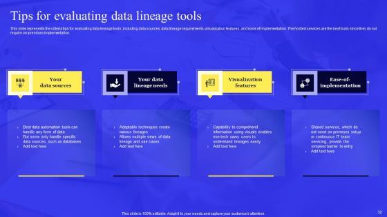 This slide represents the criteria tips for evaluating data lineage tools, including data sources, data lineage requirements, visualization features, and ease of implementation. The hosted services are the best tools since they do not require on premises implementation. Are you in need of a template that can accommodate all of your creative concepts This one is crafted professionally and can be altered to fit any style. Use it with Google Slides or PowerPoint. Include striking photographs, symbols, depictions, and other visuals. Fill, move around, or remove text boxes as desired. Test out color palettes and font mixtures. Edit and save your work, or work with colleagues. Download Business Process Data Lineage Tips For Evaluating Data Lineage Tools Themes Pdf and observe how to make your presentation outstanding. Give an impeccable presentation to your group and make your presentation unforgettable. This slide represents the criteria tips for evaluating data lineage tools, including data sources, data lineage requirements, visualization features, and ease of implementation. The hosted services are the best tools since they do not require on-premises implementation.