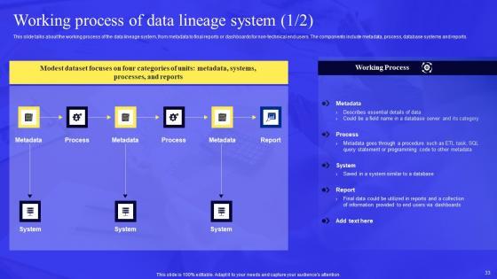 This slide talks about the working process of the data lineage system, from metadata to final reports or dashboards for non technical end users. The components include metadata, process, database systems and reports. This Business Process Data Lineage Working Process Of Data Lineage System Pictures Pdf is perfect for any presentation, be it in front of clients or colleagues. It is a versatile and stylish solution for organizing your meetings. The Business Process Data Lineage Working Process Of Data Lineage System Pictures Pdf features a modern design for your presentation meetings. The adjustable and customizable slides provide unlimited possibilities for acing up your presentation. Slidegeeks has done all the homework before launching the product for you. So, do not wait, grab the presentation templates today This slide talks about the working process of the data lineage system, from metadata to final reports or dashboards for non-technical end users. The components include metadata, process, database systems and reports.