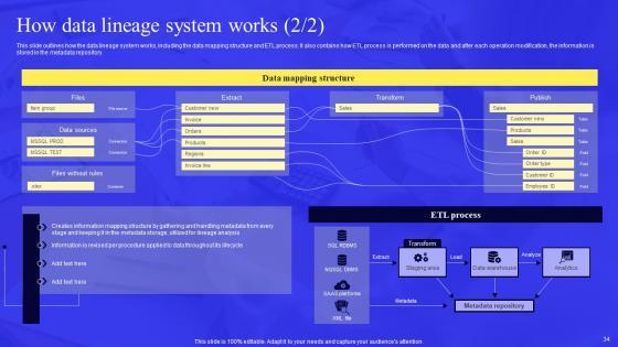 This slide outlines how the data lineage system works, including the data mapping structure and ETL process. It also contains how ETL process is performed on the data and after each operation modification, the information is stored in the metadata repository. Slidegeeks has constructed Business Process Data Lineage How Data Lineage System Works Brochure Pdf after conducting extensive research and examination. These presentation templates are constantly being generated and modified based on user preferences and critiques from editors. Here, you will find the most attractive templates for a range of purposes while taking into account ratings and remarks from users regarding the content. This is an excellent jumping off point to explore our content and will give new users an insight into our top notch PowerPoint Templates. This slide outlines how the data lineage system works, including the data mapping structure and ETL process. It also contains how ETL process is performed on the data and after each operation modification, the information is stored in the metadata repository.