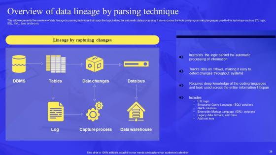 This slide represents the overview of data lineage by parsing technique that reads the logic behind the automatic data processing. It also includes the tools and programming languages used by this technique such as STL logic, SQL, XML, Java and so on. Slidegeeks is one of the best resources for PowerPoint templates. You can download easily and regulate Business Process Data Lineage Overview Of Data Lineage By Parsing Technique Infographics Pdf for your personal presentations from our wonderful collection. A few clicks is all it takes to discover and get the most relevant and appropriate templates. Use our Templates to add a unique zing and appeal to your presentation and meetings. All the slides are easy to edit and you can use them even for advertisement purposes. This slide represents the overview of data lineage by parsing technique that reads the logic behind the automatic data processing. It also includes the tools and programming languages used by this technique such as STL logic, SQL, XML, Java and so on.