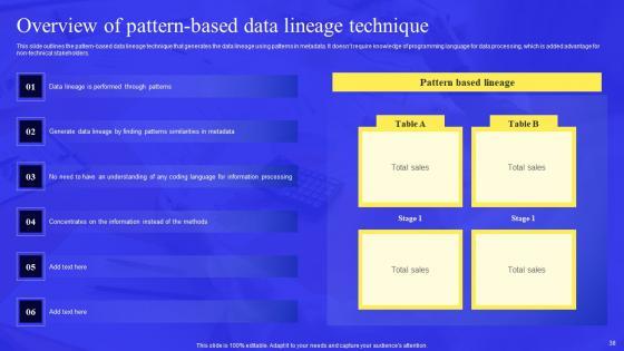 This slide outlines the pattern based data lineage technique that generates the data lineage using patterns in metadata. It does not require knowledge of programming language for data processing, which is added advantage for non technical stakeholders. Do you have to make sure that everyone on your team knows about any specific topic I yes, then you should give Business Process Data Lineage Overview Of Pattern Based Data Lineage Technique Icons Pdf a try. Our experts have put a lot of knowledge and effort into creating this impeccable Business Process Data Lineage Overview Of Pattern Based Data Lineage Technique Icons Pdf. You can use this template for your upcoming presentations, as the slides are perfect to represent even the tiniest detail. You can download these templates from the Slidegeeks website and these are easy to edit. So grab these today This slide outlines the pattern-based data lineage technique that generates the data lineage using patterns in metadata. It does not require knowledge of programming language for data processing, which is added advantage for non-technical stakeholders.