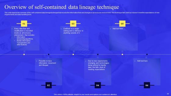 This slide depicts the overview of the self contained data lineage technique that records the information flow and changes in an inclusive environment. This technique falls short as it does not meet the expectations of new requirements and data handling tools. Get a simple yet stunning designed Business Process Data Lineage Overview Of Self Contained Data Lineage Technique Information Pdf. It is the best one to establish the tone in your meetings. It is an excellent way to make your presentations highly effective. So, download this PPT today from Slidegeeks and see the positive impacts. Our easy to edit Business Process Data Lineage Overview Of Self Contained Data Lineage Technique Information Pdf can be your go to option for all upcoming conferences and meetings. So, what are you waiting for Grab this template today. This slide depicts the overview of the self-contained data lineage technique that records the information flow and changes in an inclusive environment. This technique falls short as it does not meet the expectations of new requirements and data handling tools.