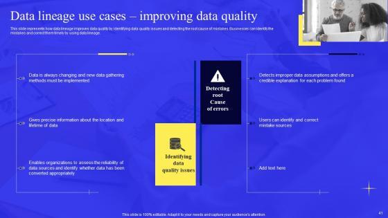 This slide represents how data lineage improves data quality by identifying data quality issues and detecting the root cause of mistakes. Businesses can identify the mistakes and correct them timely by using data lineage. This Business Process Data Lineage Data Lineage Use Cases Improving Data Quality Pictures Pdf is perfect for any presentation, be it in front of clients or colleagues. It is a versatile and stylish solution for organizing your meetings. The Business Process Data Lineage Data Lineage Use Cases Improving Data Quality Pictures Pdf features a modern design for your presentation meetings. The adjustable and customizable slides provide unlimited possibilities for acing up your presentation. Slidegeeks has done all the homework before launching the product for you. So, do not wait, grab the presentation templates today This slide represents how data lineage improves data quality by identifying data quality issues and detecting the root cause of mistakes. Businesses can identify the mistakes and correct them timely by using data lineage.