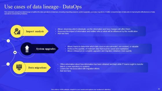 This slide talks about how data lineage simplifies the data operations DataOps, including impacting analysis, system upgrades, and data migrations. A better comprehension of data aids in improving the effectiveness of data operations and avoiding mistakes. Formulating a presentation can take up a lot of effort and time, so the content and message should always be the primary focus. The visuals of the PowerPoint can enhance the presenters message, so our Business Process Data Lineage Use Cases Of Data Lineage Dataops Designs Pdf was created to help save time. Instead of worrying about the design, the presenter can concentrate on the message while our designers work on creating the ideal templates for whatever situation is needed. Slidegeeks has experts for everything from amazing designs to valuable content, we have put everything into Business Process Data Lineage Use Cases Of Data Lineage Dataops Designs Pdf. This slide talks about how data lineage simplifies the data operations DataOps, including impacting analysis, system upgrades, and data migrations. A better comprehension of data aids in improving the effectiveness of data operations and avoiding mistakes.