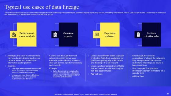 This slide outlines the typical use cases of data lineage that include performing root cause analysis, generating reports, deprecating columns, and setting data retention policies. Data lineage enables a broad range of information use applications for IT departments and various stakeholder groups. Make sure to capture your audiences attention in your business displays with our gratis customizable Business Process Data Lineage Typical Use Cases Of Data Lineage Elements Pdf. These are great for business strategies, office conferences, capital raising or task suggestions. If you desire to acquire more customers for your tech business and ensure they stay satisfied, create your own sales presentation with these plain slides. This slide outlines the typical use cases of data lineage that include performing root-cause analysis, generating reports, deprecating columns, and setting data retention policies. Data lineage enables a broad range of information use applications for IT departments and various stakeholder groups.