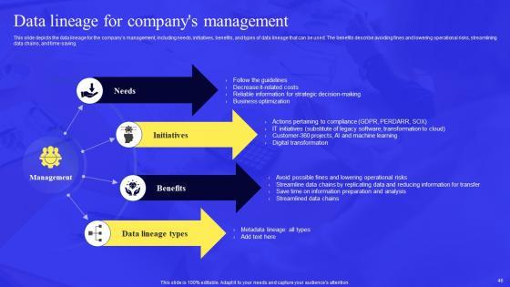 This slide depicts the data lineage for the company management, including needs, initiatives, benefits, and types of data lineage that can be used. The benefits describe avoiding fines and lowering operational risks, streamlining data chains, and time saving. Are you in need of a template that can accommodate all of your creative concepts This one is crafted professionally and can be altered to fit any style. Use it with Google Slides or PowerPoint. Include striking photographs, symbols, depictions, and other visuals. Fill, move around, or remove text boxes as desired. Test out color palettes and font mixtures. Edit and save your work, or work with colleagues. Download Business Process Data Lineage Data Lineage For Companys Management Graphics Pdf and observe how to make your presentation outstanding. Give an impeccable presentation to your group and make your presentation unforgettable. This slide depicts the data lineage for the company management, including needs, initiatives, benefits, and types of data lineage that can be used. The benefits describe avoiding fines and lowering operational risks, streamlining data chains, and time-saving.